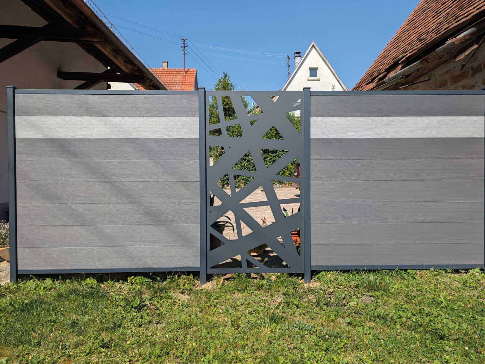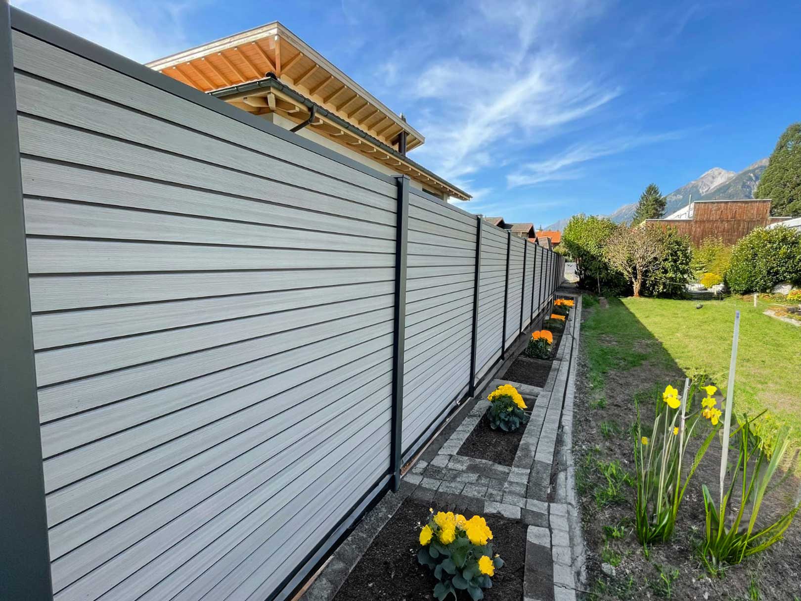 Mit den Alu-Composite-Design Zaunfeldern lassen sich nebenher die verschiedensten Design-Materialien wie Glasstreifen, ebenso wie Edelstahl.- oder Aluminiumbleche flexibel nach Ihren Wünschen verbauen. Dadurch bieten wir Ihnen also jede Menge an Möglichkeiten Ihren individuellen Gartenzaun oder auch Sichtschutz umzusetzen.